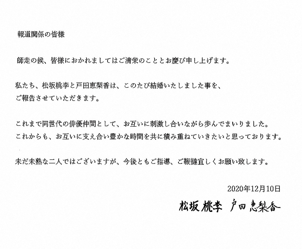 最近結婚した芸能人カップル Photo by スポニチ 松坂桃李、戸田恵梨香が電撃婚!2年前から同じマンション、育んだ“隠密愛” ギャラリーで見る この記事のフォト 2020年12月11日の画像一覧 もっと見る 2020年12月11日の画像をもっと見る