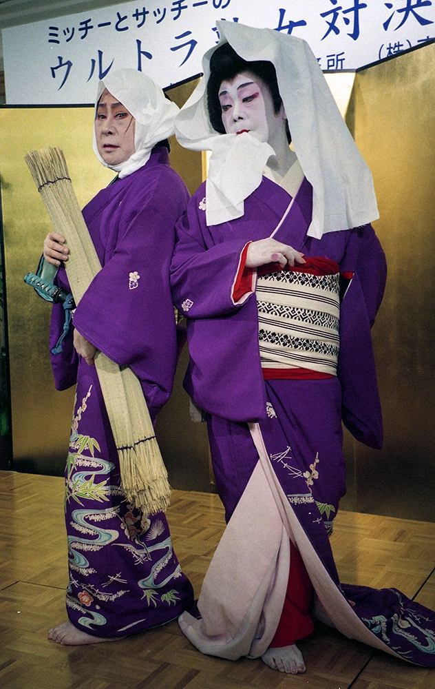 98年、舞台「ミッチーとサッチーのウルトラ熟女対決」製作発表会で舞台姿を披露した野村沙知代さん(右)と浅香光代さん