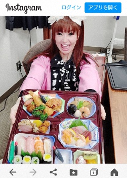 「きゃ~豪華過ぎるロケ弁ぼよ~」とつづり、笑顔で寿司や刺身、揚げ物、煮物にフルーツを差し出している写真をアップ。ハッシュタグで「ロケに行かせて頂けた 企業さんからの差し入れ お弁当 有り難いです これはもはや昼食じゃ勿体ないです」などと説明した。
