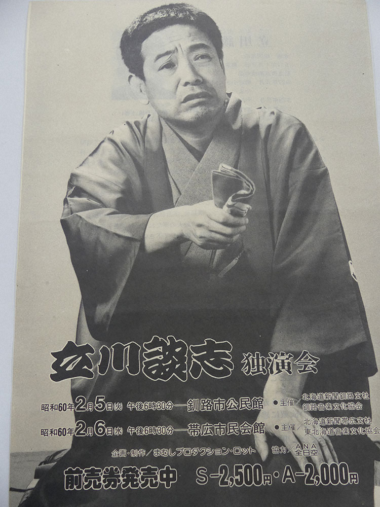 ちなみに別な古書店にはかつてこんなチラシも置いてあったらしい。1979年11月17日の釧路市民文化会館(現コーチャンフォー釧路文化ホール)の落成記念で行われた落語名人会。小さん、志ん朝、談志が勢ぞろい。他にも柳家さん喬、古今亭志ん八(後に右朝に改名)の名前が見える豪華版。タイムスリップしたくなった。
