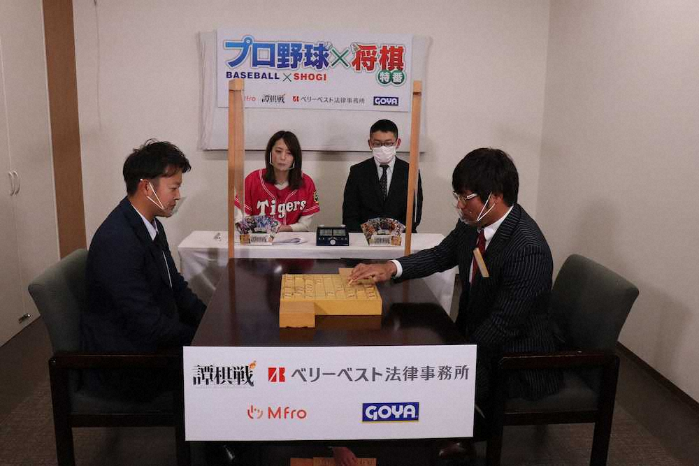 前半は「球王決定戦」を開催。第2局は中日・平田良介外野手(32)と阪神・斎藤友貴哉投手(25)による顔合わせとなった。両者ともスーツ着用で登場。平田はメガネ姿で対局に臨んだ。