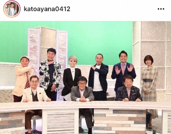 「ついに今日」「是非ご覧ください 楽しみだー」と夫の出演番組をPRし、茶、高木ブー(87)、仲本工事(79)、研ナオコ(67)ら共演者で撮影した集合写真をアップ。千鳥の大悟(40)、ダチョウ倶楽部の肥後克広(57)と上島竜兵(59)は、志村けんさん(享年70)のギャグ「アイーン」を笑顔で披露している。
