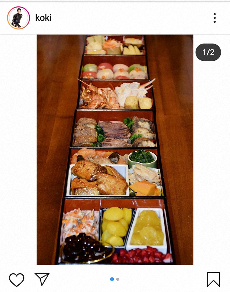 俳優の木村拓哉(48)と次女のKoki,(コウキ、17)が31日、ほぼ同時間に自身のインスタグラムを更新し、6段重の豪華なおせち料理を披露した。