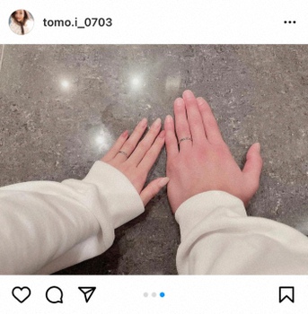 3枚目の写真には、お互いの左手を写真を投稿。それぞれの薬指に指輪が光っている。