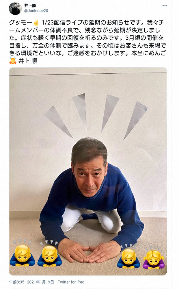 タレントの井上順 Photo by スポニチ 井上順 23日配信ライブ延期で土下座 メンバーの体調不良で ギャラリーで見る この記事のフォト 2021年01月19日の画像一覧 もっと見る 2021年01月19日の画像をもっと見る