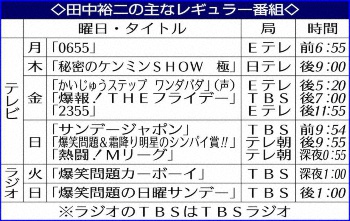 売れっ子だけに仕事への影響は大きい。田中が持っているレギュラー番組は11本。当面の間、コンビでの出演番組は相方の太田光(55)が1人で臨むとみられる。田中が出演し、久本雅美(62)とともに司会進行をしている日本テレビ系「秘密のケンミンSHOW 極」は、コロナ休養中の代役を太田が務めた。今回は昨年の休養よりも復帰までに時間を要するが、ゆっくりと静養することが大切となる。