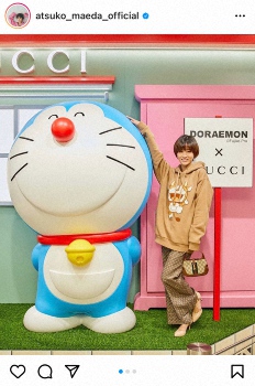 前田は「素敵なコラボレーションDORAEMON × GUCCIに行ってきました!」と報告し「親しみのあるドラえもんとGUCCIの世界観が重なって、