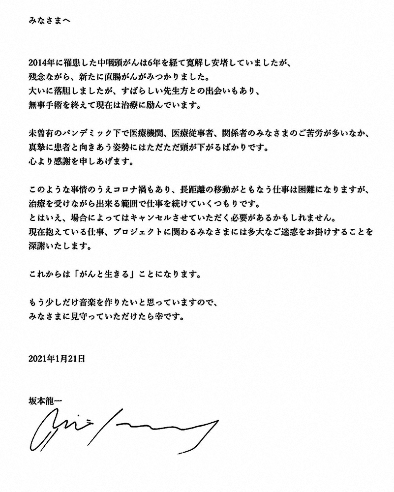 直腸がんの手術を受けたことを公表した坂本龍一(撮影・木村 揚輔) Photo by スポニチ 坂本龍一 直腸がんで手術、入院中 中咽頭がんに続き2度目の闘病「もう少… ギャラリーで見る この記事のフォト 2021年01月22日の画像一覧 もっと見る 2021年01月22日の画像をもっと見る