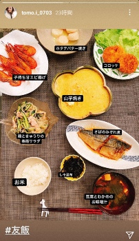 「#友飯」として度々インスタグラムに料理の写真をアップしている板野だが、この日は食卓にコロッケ、ホタテバター焼き、子持ち甘エビ揚げ、山芋焼き、鶏ときゅうりの春雨サラダ、さばのみそ煮、しそ昆布とご飯、豆腐とわかめのお味噌汁が並んだ画像をストーリーズにアップ。おかずだけで7品とボリューム満点だ。