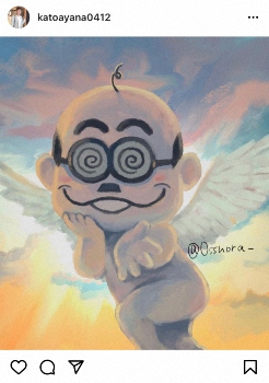 綾菜は「今の待ち受けです」というコメントともに、天使のような、ユーモラスな夫のイラストを投稿。「携帯開くと癒されます」とつづりつつ、「同じポーズをしていたら カトちゃん引いてました」と明かした。