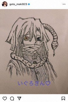 後藤は「鬼滅キャラで私的No. 1いぐろさんを夜な夜な描いてみた」とつづり、人気アニメ「鬼滅の刃」の鬼殺隊の隊士の一人で蛇柱「伊黒小芭内」を描いた絵を披露した。ハッシュタグには「#絵」「#鬼滅キャラ」「#お絵描きタイム」「#漫画みて惚れた」「#かぶらまる飼いたい人」と添えた。