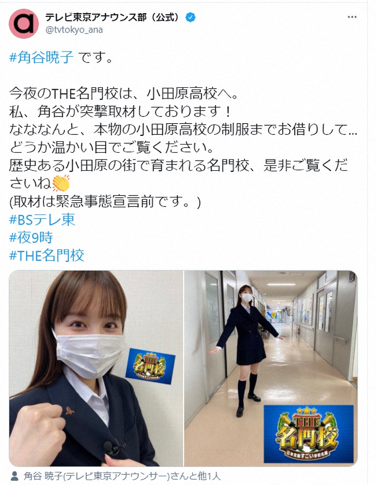 テレビ東京アナウンス部公式ツイッター(@tvtokyo_ana)より テレ東・角谷アナ「どうか温かい目で」高校の制服姿披露 フォロワー「現… ギャラリーで見る この記事のフォト 2021年02月08日の画像一覧 もっと見る 2021年02月08日の画像をもっと見る