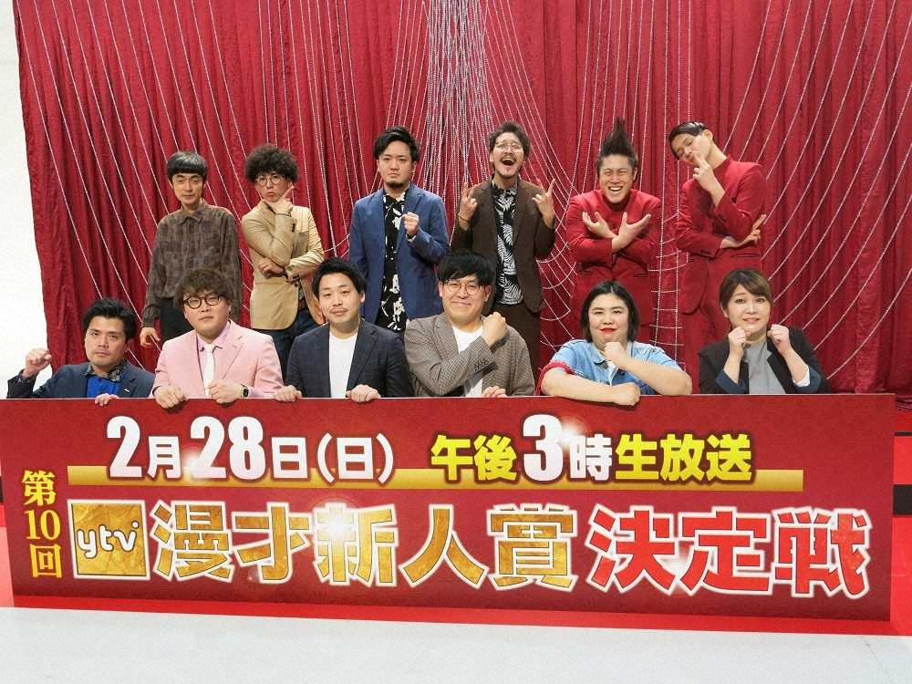 関西で活躍する芸歴10年以内の若手が競う「第10回ytv漫才新人賞決定戦」の本選に出場するマユリカ、タチマチ、紅しょうが、たくろう、隣人、コウテイのお笑いコンビ6組12人が8日、読売テレビ(大阪市中央区)で会見に臨んだ。