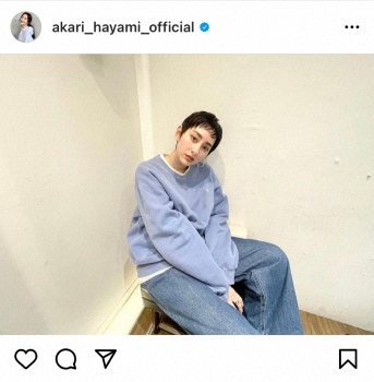 早見は「人生で一番短くなりました!」と椅子に座り、ポーズを決めた1枚の写真を投稿。「仕事がない今じゃないと出来ない!自分ウケ最高」とベリーショート姿を公開した。