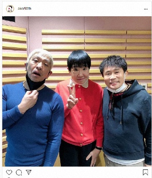 「色んな所で話題になってますが、私のラジオ番組、ニッポン放送『アッコのいいかげんに1000回』にダウンタウンの2人がゲストで来てくれました 番組の30周年イヤーの最後のゲストに2人で(松ちゃん、変な顔です 3枚ともこの顔だからこれしかないのでごめんなさい)」とつづった。