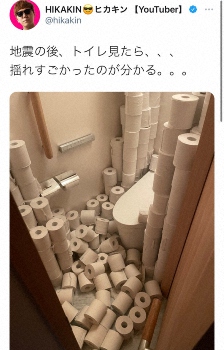 ヒカキン公式ツイッター(@hikakin)より ヒカキン「地震の後、トイレ見たら、、、」山積みのトイレットペーパー倒壊 ギャラリーで見る この記事のフォト 2021年02月14日の画像一覧 もっと見る 2021年02月14日の画像をもっと見る