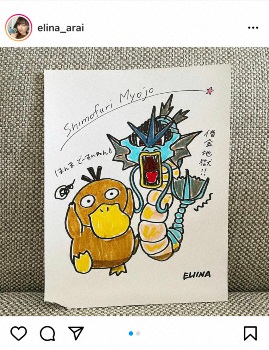 2組とテレビ朝日「爆笑問題&霜降り明星のシンパイ賞!!」(日曜後9・55)で共演する新井。「ポケモン見てたらどうしてもイメージが重なってきてしまって…描きたくなっちゃいました」と記し、「●ギャラドス 粗品さん風 ●コダック=せいやさん」と補足を添え、投稿。イラストでは粗品風ギャラドスには「借金地獄」、せいや風コダックには「ほんま、どーすんねん!」とコメントまで添えた。