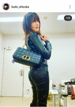 バッグは「クールにもフォーマルにも素敵な」ディオール、ジャケットは「この間も着ていた」イヴ・サンローラン、パンツは「もう古いしそろそろ破れるであろう皮パン 限界を迎えている」ラグ&ボーンのものであるとした。2枚目には後ろ向きでバッグを見せている姿を、3枚目では黒のマスクをして黒のブーツで合わせた全身写真をアップし、美脚が際立つものとなっている。