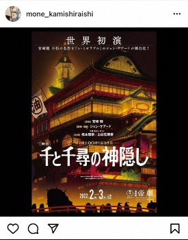 千尋が神々が往来する町に迷い込み、湯屋「油屋」で働きながら成長する物語。映画では摩訶(まか)不思議な世界が描かれており、今回はさまざまな手法を駆使し舞台上に油屋などを再現する。 ミュージカル「レ・ミゼラブル」の世界初演を演出したジョン・ケアード氏が翻案・演出を手掛ける。上白石とは18年に舞台「ナイツ・テイル」でタッグを組んでいる。