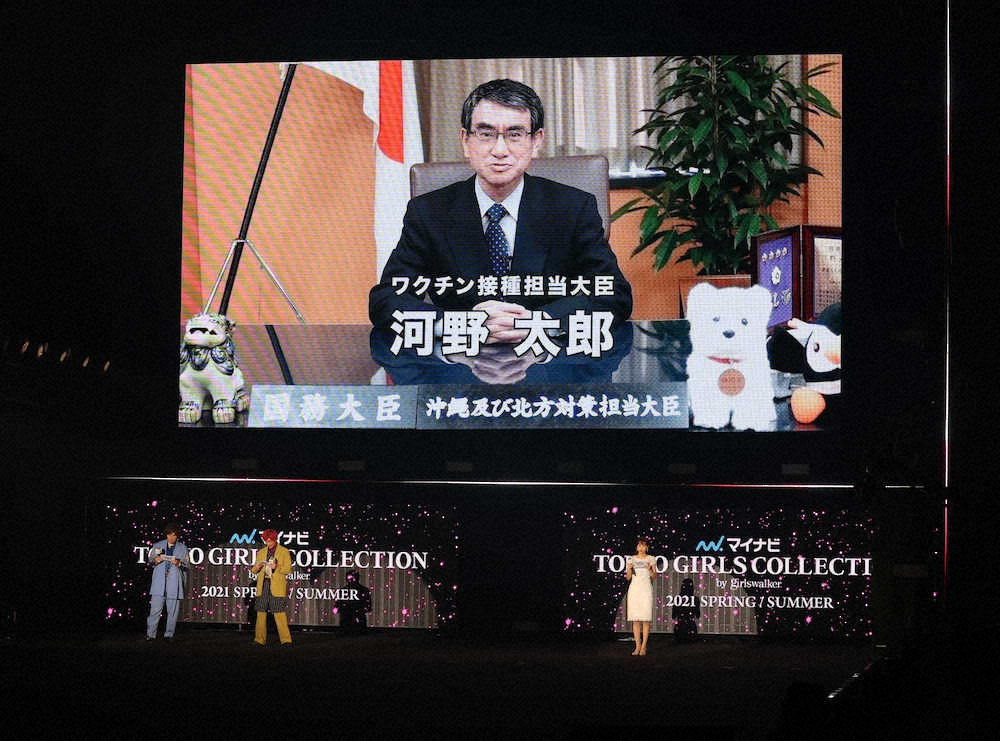 大規模ファッションイベント「第32回東京ガールズコレクション」が28日、東京・国立代々木競技場第1体育館で行われ、河野太郎ワクチン担当相がビデオメッセージで登場。新型コロナウイルスワクチンの接種を呼び掛けた。