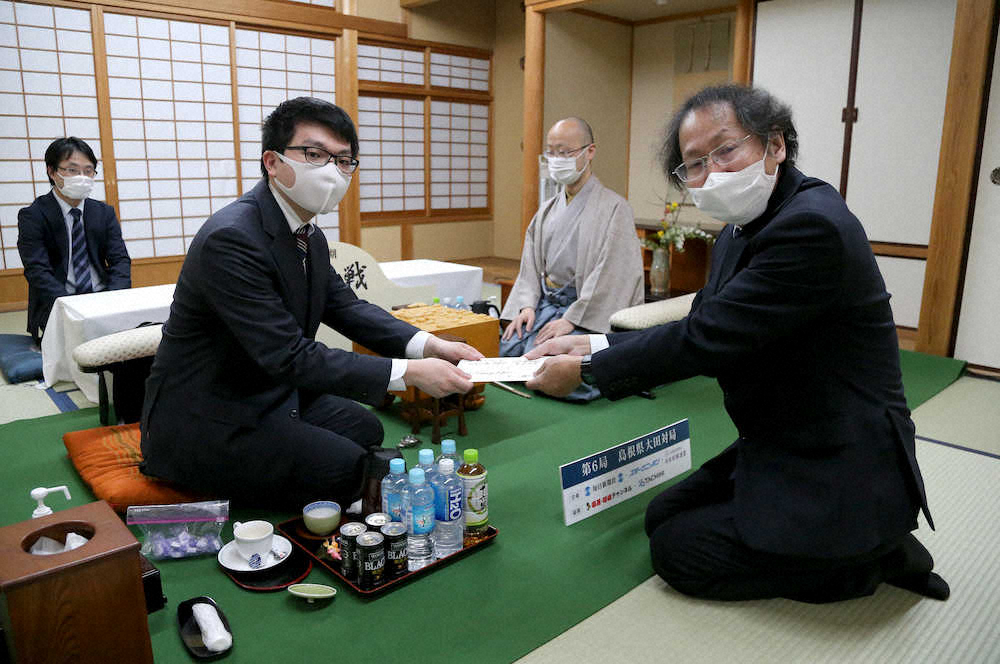 <王将戦第6局>初日、福崎立会人に封じ手を手渡す永瀬王座(左)(撮影・中村 達也)