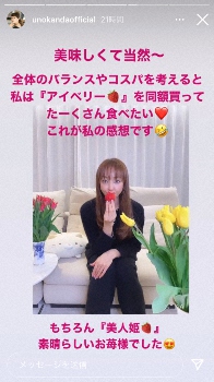 ハッシュタグには「美人姫」「なんとビックリ」「お1つ17000円」「テンション上がりましたが」「あっけなく終わった」「最高に美味しかった」「でもそうでないと詐欺だ」「香り高い苺」「見た目も芸術的」「お味はアイべリーに似ている」「お味はアイべリー系」「王様苺」「美人姫は美人過ぎ」「お値段高過ぎ」「何事も経験」「同じ17000円出すならアイべリーを17000円分買ってお腹いっぱい食べたい(笑)」などと素顔すぎる感想も記している。