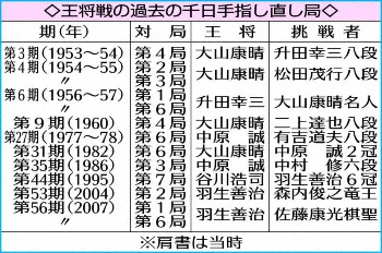 王将戦7番勝負の千日手は、羽生善治王将が佐藤康光棋聖の挑戦を受けた第56期第6局以来14年ぶり。その第56期は第1局も千日手となり2度千日手が現れた。このときは実質9局目の第7局を羽生が制し、通算10期の獲得で2人目の永世王将に輝いている。