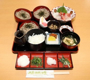 両者が注文したそばは、三瓶高原で栽培された香りの強い田舎そばで、さんべ荘の厨房で「引きたて」、「打ちたて」、「ゆでたて」の3点にこだわった一品。そばを入れる器の「割子(わりご)」は戦国時代の武士たちの使っていた弁当箱が起源といわれ、丸い容器を3段に重ねて提供するのが一般的とされている。