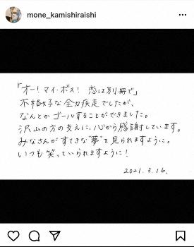 上白石は最終回から一夜明け、17日の朝、メッセージを投稿。「『オー!マイ・ボス!恋は別冊で』不格好な全力疾走でしたが、なんとかゴールすることができました。沢山の支えに、心から感謝しています。みなさんがすてきな“夢”を見られますように。いつも笑っていられますように!2021.3.16」と丁寧な直筆メッセージでファンに感謝を伝えた。