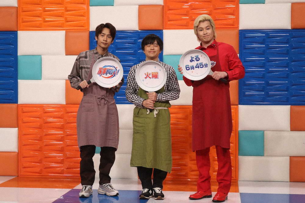 お笑い芸人のバカリズム(45)、KAT―TUNの中丸雄一(37)、メイプル超合金のカズレーザー(36)が出演するテレビ朝日「家事ヤロウ!!!」が23日からゴールデン帯(火曜後6・45)に進出する。3人は18日、都内で会見。2018年に放送を開始した3人が家事を学ぶ番組。やりたいことを聞かれたカズレーザーは「裏番組の面白そうな企画は積極的にまねしていきたい」と話し、会場の笑いを誘った。