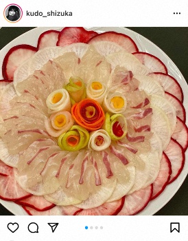 「最近よく食卓に登場する一品!カルパッチョです」と花型に盛りつけられた色鮮やかな4枚の写真を投稿。「カブ、大根、人参、色が移らないように、別々にお酢、塩、砂糖、昆布などで味を付けしんなりさせます。そしてお好きなお魚で!」とレシピを紹介。「割とどんな魚にも合います!オリーブオイルに塩、レモン、や、ポン酢にも合います」とつづった。
