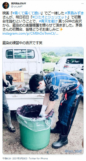 吉沢亮 Photo by スポニチ 「青天を衝け」主演の吉沢亮 藍染め練習姿に反響「真剣な表情の亮くん素… ギャラリーで見る この記事のフォト 2021年03月28日の画像一覧 もっと見る 2021年03月28日の画像をもっと見る