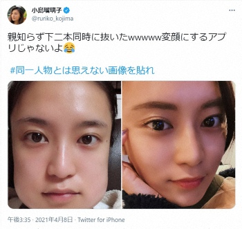 小島は「親知らず下二本同時に抜いたwwwww」と告白し、ビフォーアフターの写真を投稿。両方のほっぺが腫れあがり、四角になった衝撃ショットに「変顔にするアプリじゃないよ」と自らツッコミを入れつつ「#同一人物とは思えない画像を貼れ」と添えた。