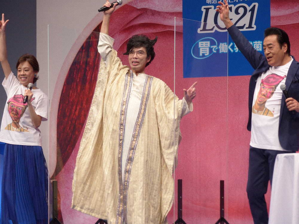 「明治プロビオヨーグルトLG21」の発売21周年記念イベントが8日都内で行われ、ブランドキャラクターの俳優の片桐仁(47)、ゲストで俳優の高橋英樹(77)、フリーアナウンサーの高橋真麻(39)父娘が参加した。