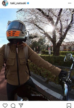 滝は青空の下、桜を背景に愛車のバイクにまたがる姿の写真を披露。ブラウンのジャケットにリュックサックを背負い、フルフェイスのヘルメットという装いで、「動画編集中」とコメントし「#バイク」「#ツーリング」「#360度カメラ」とハッシュタグと共に投稿した。