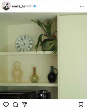 今回は「キッチンのこの眺め好きな場所」とつづり、時計や植物、置物が並ぶ棚の写真をアップ。自宅のお気に入りのスペースを紹介した。