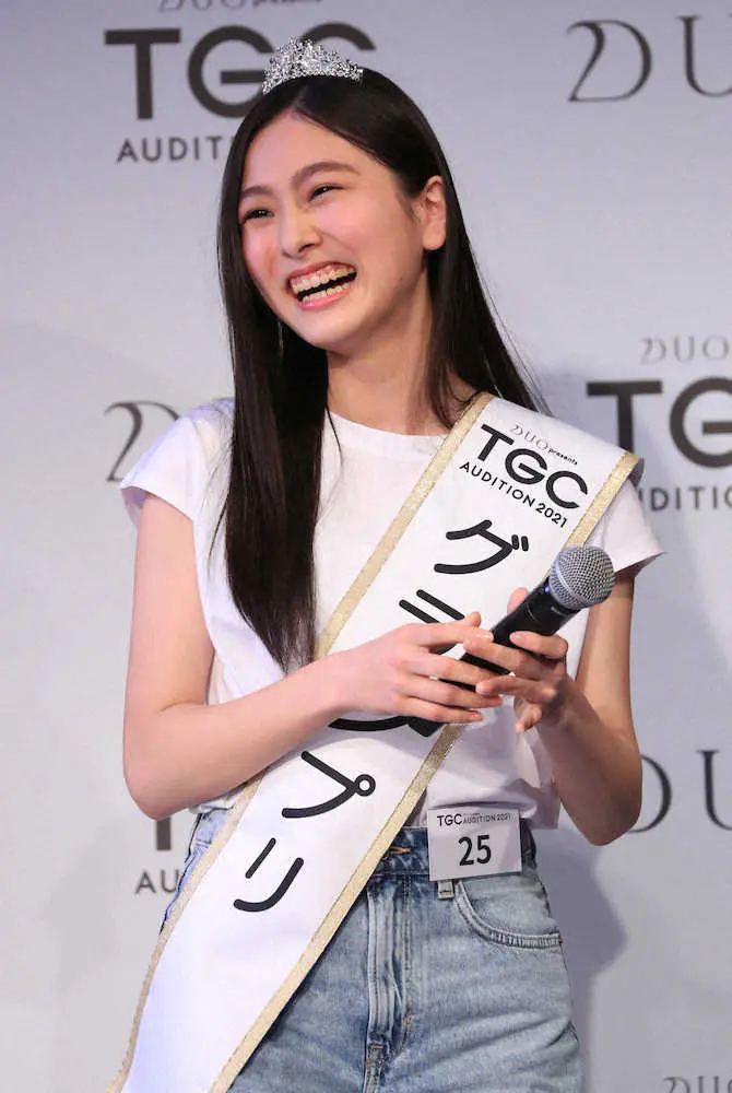 <TGCオーディション2021>グランプリに輝き笑顔を見せる寺島季咲(撮影・西尾 大助)