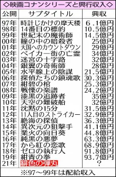 アニメ映画の人気シリーズ第24作「名探偵コナン 緋色の弾丸」が、興収100億円突破確実の絶好のスタートを切った。16日に全国497館で封切られ、初日だけで6億円余りの興収を記録。シリーズ最高の93億7000万円を記録した19年の前作「紺青の拳(フィスト)」との対比で144%の出足となった。