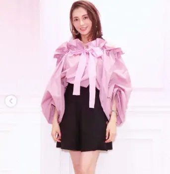 「“PATOU” GINZA SIX.息子の習いごとの後、子連れでちらりとお邪魔してきました。美しく、愛らしいフレンチシックなブランド」とつづり、淡いパープルのトップスに紺のショートパンツを合わせた自身の写真をアップした。