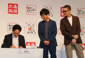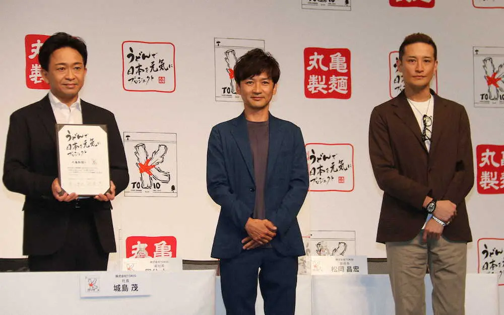 城島のあいさつを聞いていた国分は「タレントとしてこういう場所として立つことはあるんですが、会社の副社長として立つのは初めて。今までリーダーと呼んでいた方が社長になりまして、リーダーの時はよく噛んでいたんですけど、社長になったら噛まなくなっている。ちょっと驚いています」と“社長”をイジりつつ、「これからもついていっていいですか?」と笑顔。松岡も「普段生活している中で身近にある丸亀製麺さんからお話をいただいたことにびっくりしました。いろいろな方々と会って、勉強させてもらいました。そのノウハウみたいなものが役に立つなら。我々が株式会社TOKIOの1発目のお仕事としてやらせていただくことに感謝します」と話しつつ、最後は「うちの城島がこんなに滑らかに話すようになったことを感無量です」としっかりと“社長”をイジって笑わせた。