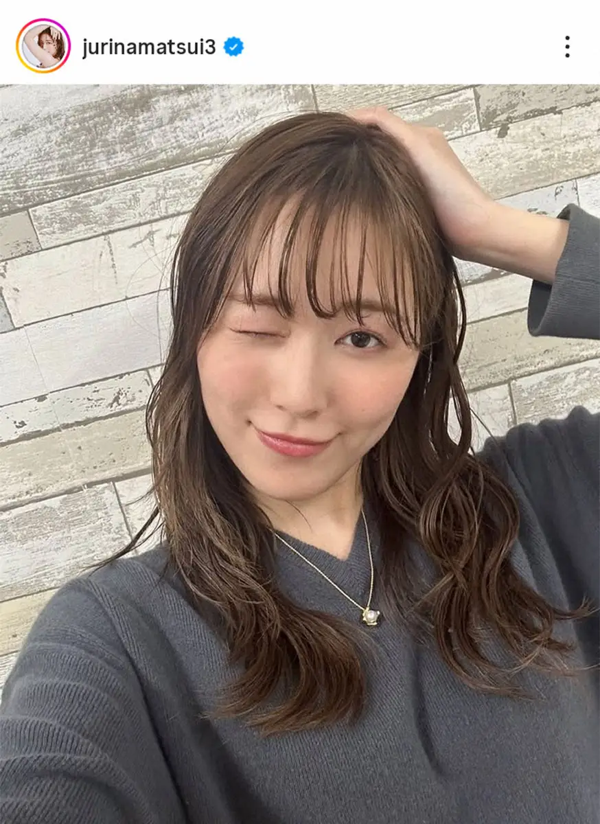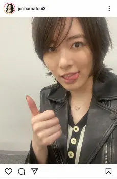 松井はショートの外はねのヘアスタイルに、黒い革のライダースジャケットを着て、舌を出し、右手の親指を立てるポーズの写真を投稿。「#好きですか? #ショート好評 #ヘアスタイル #自撮り #加工なし」などと付け加えた。