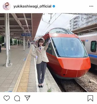 「ロマンスカーでイベント ミュージックロマンスカーでのイベント第一号になりました」とつづり投稿されたのは、駅のホームでロマンスカーと並び、左腕を空へ向け指差しポーズを取る自身の写真。白いジャケットと制帽姿で、車掌になりきっている。