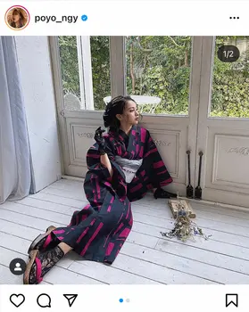 ゆきぽよは、黒地に濃いピンクの浴衣を着用し、黒レースの手袋と足袋を身に着け、下駄をはいた全身ショットをアップ。「今年の浴衣はこんな感じがトレンドらしいです。とりあえずレース手袋合わせとけば」と説明した。