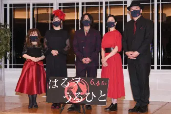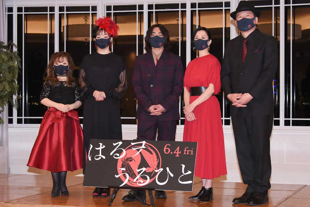 映画「はるヲうるひと」完成報告会見に出席した(左から)笹野鈴々音、今藤洋子、山田孝之、坂井真紀、佐藤二朗