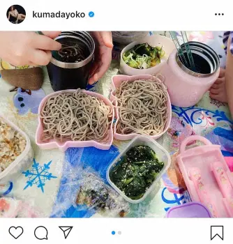 熊田は、「麺をお弁当にするというチャレンジをしてみたよ」とコメント。弁当箱の中にある麺の傍らには、麺つゆが入った容器を持つ子供の手が写っている。この弁当について、「麺つゆがとびまくるけど美味しいし楽しいし、子供達がよく食べるからOK」とつづった。