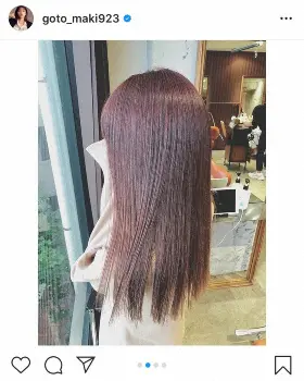 「ルビーカラーにしたよ」とコメントし投稿されたのは、新しいヘアスタイルの写真。1枚目は横顔を写したもので、視線を窓の外に向けたもので、後藤の長い髪が赤やピンク色が混ざったような、鮮やかなルビー色に染まっていることが分かる。