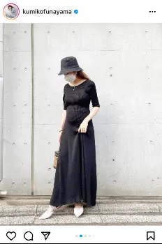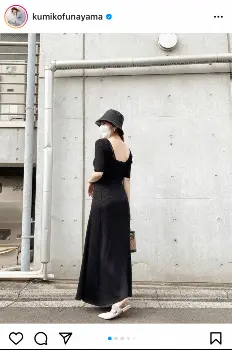 4月16日に第1子妊娠を報告した舟山は、「たまには真っ黒くろすけ。タイトニットで着痩せしつつもお腹を目立たせてみました。背中開きが可愛いの。肩甲骨はどこかへお出掛け中です」とつづり、黒の帽子に背中がざっくり開いた黒のワンピースを合わせた、ブラックコーデを投稿した。