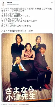 「ダンディでお茶目な正和さんと何本か作品でご一緒出来たこと、とても幸せで “さよなら小津先生”スタジオの、職員室のセット…いつも楽しかったです…ずっと皆で笑ってたような気がします さびしいです、あぁやっぱりかっこいいですね 心よりご冥福をお祈りいたします」と記し、ドラマのポスターの画像を投稿した。