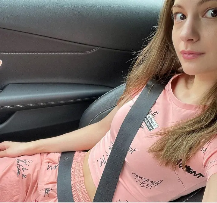 「今日の衣装」とつづり、ボディーラインが分かるショート丈のピンク色のTシャツとパンツ姿で車の座席に座り、おなかをのぞかせている写真をアップした。
