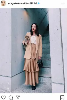 「#麻友コーデ」とハッシュタグをつけ、この日のコーディネートを紹介し、全身ショットをアップ。茶色のジャケットに、3段でざっくりとしたティアードと少し光沢感のある生地が特徴的なスカートを合わせた、エレガントな装いになっている。さらに河北は、左手に高級ファッションブランド・グッチのバッグを持ち、右わきには小さな愛犬を抱えている。